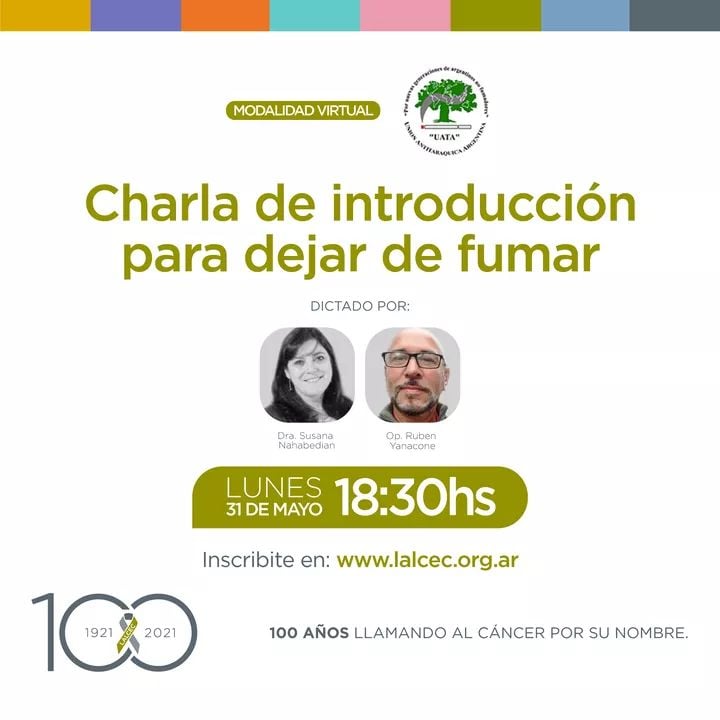 Este lunes 31 de mayo se realizará una c𝐡𝐚𝐫𝐥𝐚 𝐆𝐑𝐀𝐓𝐔𝐈𝐓𝐀 𝐝𝐞 𝐢𝐧𝐭𝐫𝐨𝐝𝐮𝐜𝐜𝐢𝐨́𝐧 𝐩𝐚𝐫𝐚 𝐝𝐞𝐣𝐚𝐫 𝐝𝐞 𝐟𝐮𝐦𝐚𝐫 dictada por la DRA. SUSANA E. NAHABEDIAN & RUBEN D. YANNACONE a través de google Meet