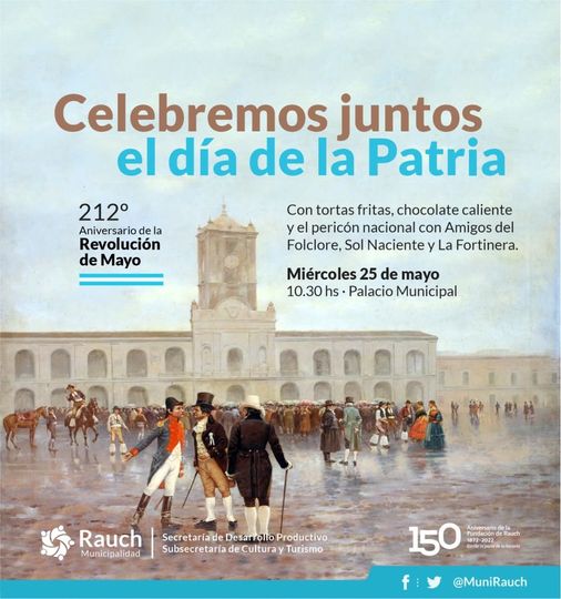 Se cumplen el 212° aniversario de la Revolución de Mayo. El Gobierno Municipal invita a la población a sumarse a los festejos, previstos para el día miércoles 25, a las 10,30 horas, frente al Palacio Municipal.Habrá tortas fritas, chocolate caliente y el pericón nacional a cargo de las agrupaciones folklóricas Amigos del Folclore, Sol Naciente y La Fortinera.(Prensa Municipal)