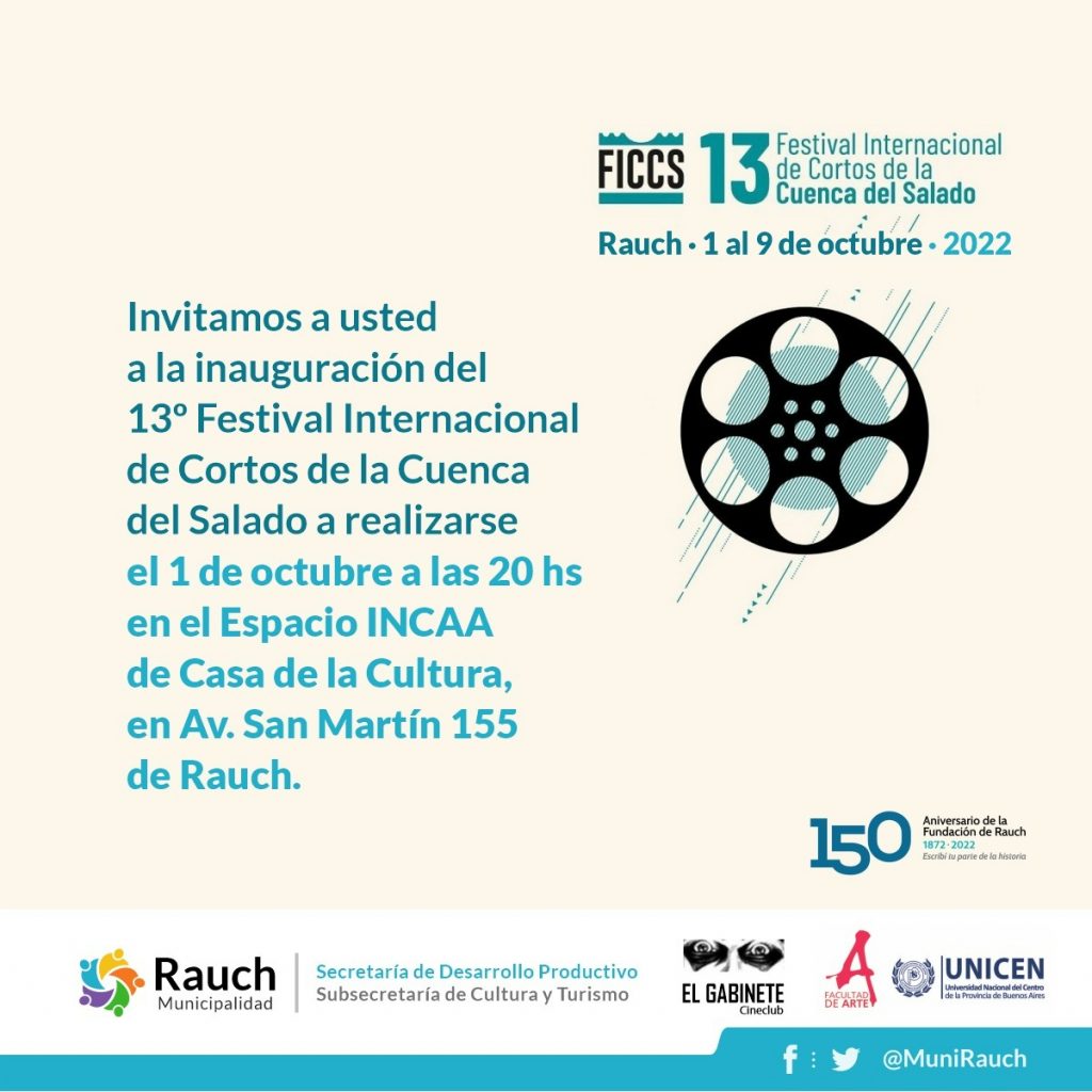 El 1 de octubre se lanza la 13° Edición del Festival Internacional de Cortos de la Cuenca del Salado que organiza el Cineclub “El Gabinete” con el apoyo de la Subsecretaría de Cultura de la Municipalidad de Rauch y el aval de la Facultad de Artes de la UNICEN.