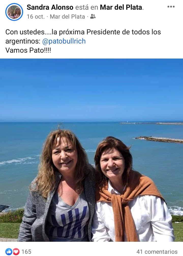 Por su parte Sandra Alonso, Delfina Passeggi y Valeria Cejas, entre otros, estuvieron en los últimos días en un plenario que se desarrolló en Mar del Plata y que tuvo como principal figura a la ex Ministra de Seguridad de Macri Patricia Bullrich, una de las posibles aspirantes a la Presidencia por Juntos para las elecciones de 2023.