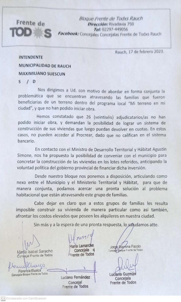 Beneficiarios del programa ‘Mi terreno mi ciudad’ firmaron una nota dirigida al intendente solicitando un plan de pago para pode construir su casa, ya que, por los alto precios de materiales, se les hace imposible hacerlo por sus propios medios. La misma fue presentada al intendente y debatida junto al bloque de Frente de Todos