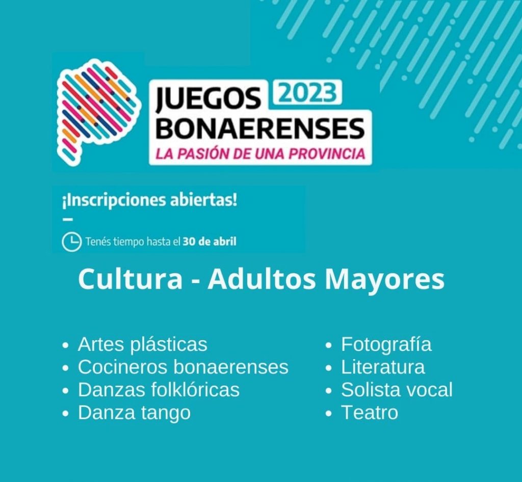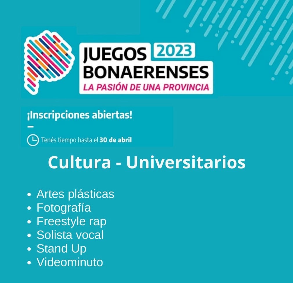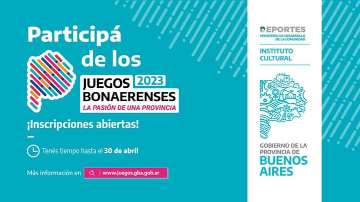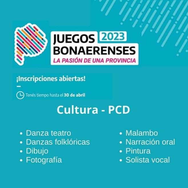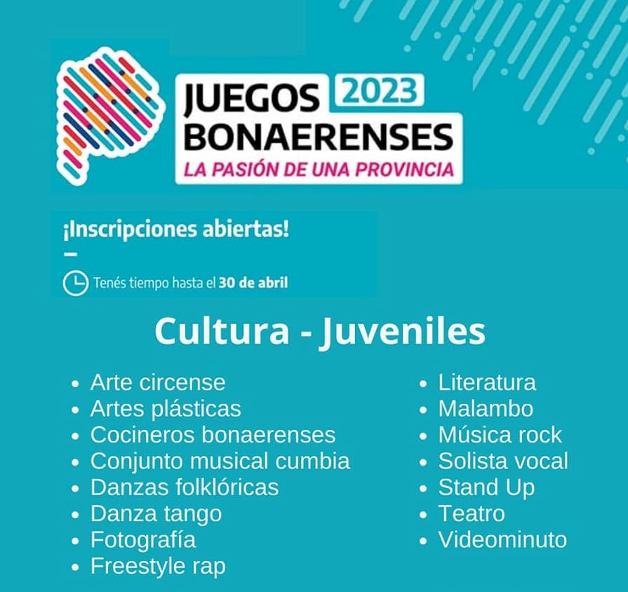 La Subsecretaria de Cultura y Turismo informa a la comunidad que se encuentra abierta la inscripción de los JUEGOS BONAERENSES 2023 – CULTURA hasta el día 30 de Abril, inclusive.