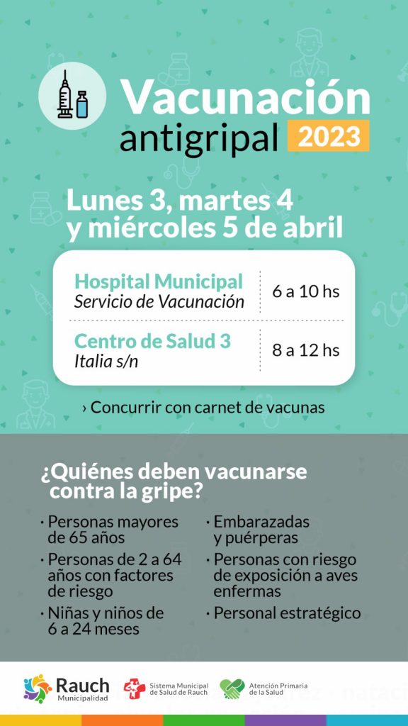 El sistema municipal de salud continua la campaña de vacunas antigripales que inició el 10 de marzo, para personal de salud, niños entre 0 y 24 meses, embarazadas, personas mayores de 65 años y personas con patologías de riesgos. La misma se puede aplicar en consultorios externos del hospital de 06:00 a 10:00 horas y en el centro de salud número tres de 08:00 a 12:00 horas
