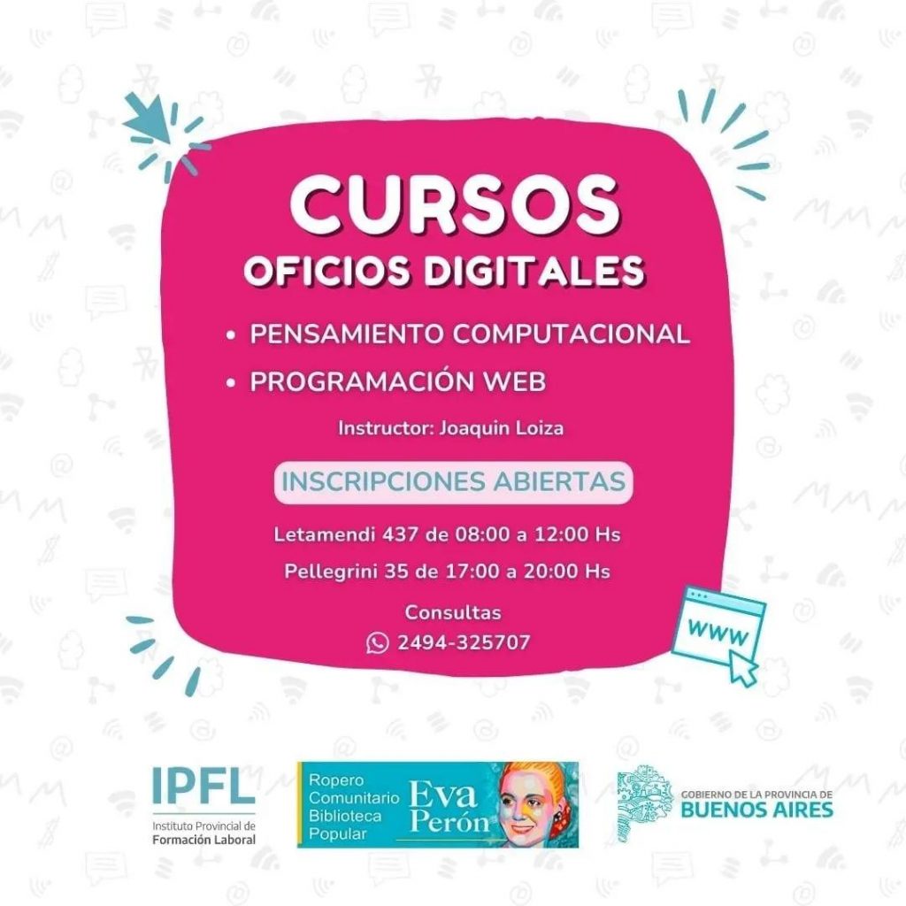 La Biblioteca Popular Eva Perón poner en funcionamiento desde hoy el dictado de 2 cursos sobre herramientas digitales que se van a desarrollar en la institución: uno introductorio llamado Pensamiento computacional, y otro complementario sobre Programación web.