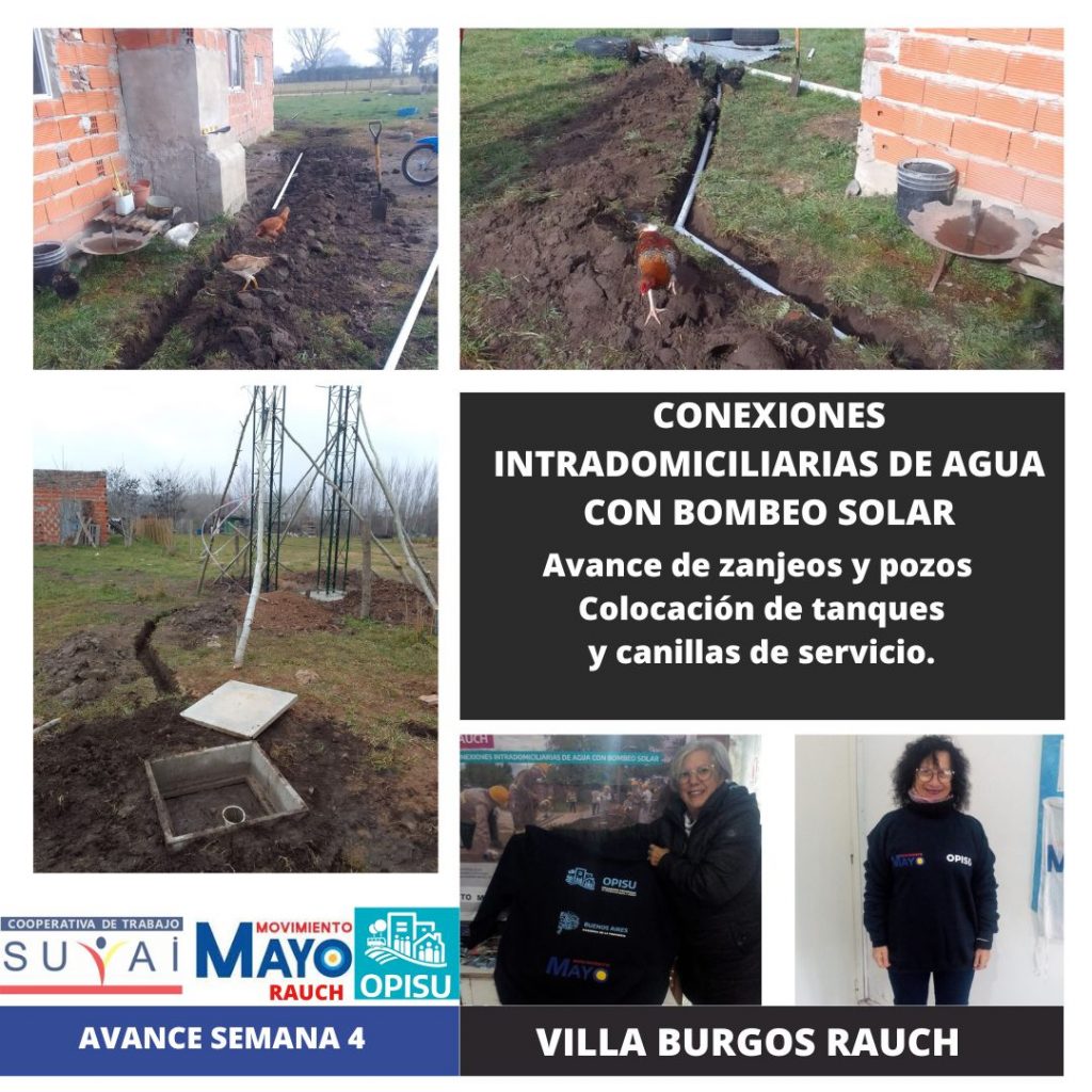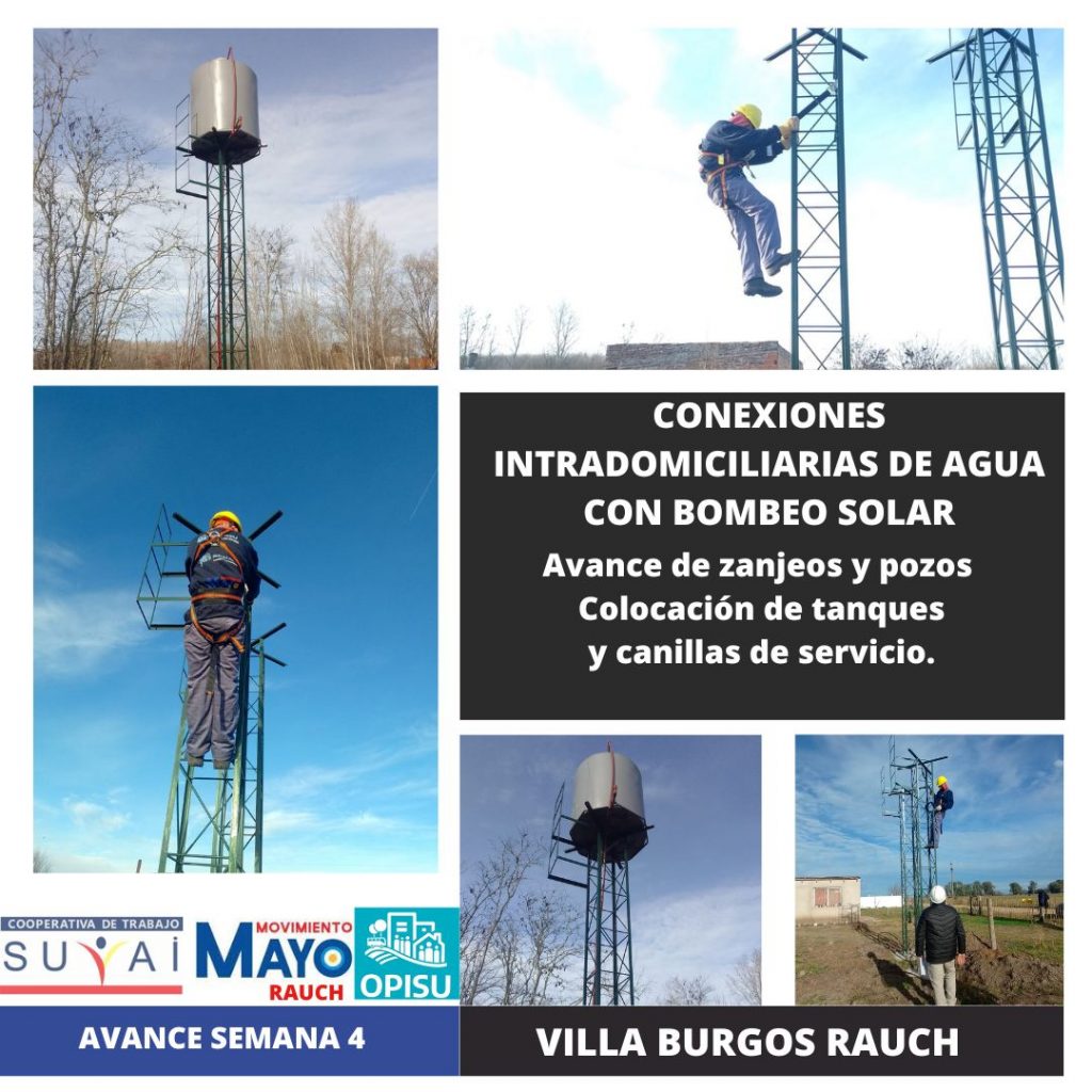 “Continúan las obras en Villa Burgos de Conexiones intradomiciliarias de agua por bombeo solar financiadas por el gobierno de la provincia de Buenos Aires a través del OPISU con articulación cooperativa entre Cooperativa SUYAI y Cooperativa MAYO. En la semana 4 se completó la perforación de otro pozo. Se colocaron los tanques y canillas de servicio con la supervisión del Ingeniero Nestor Puglia de los elementos de seguridad”
