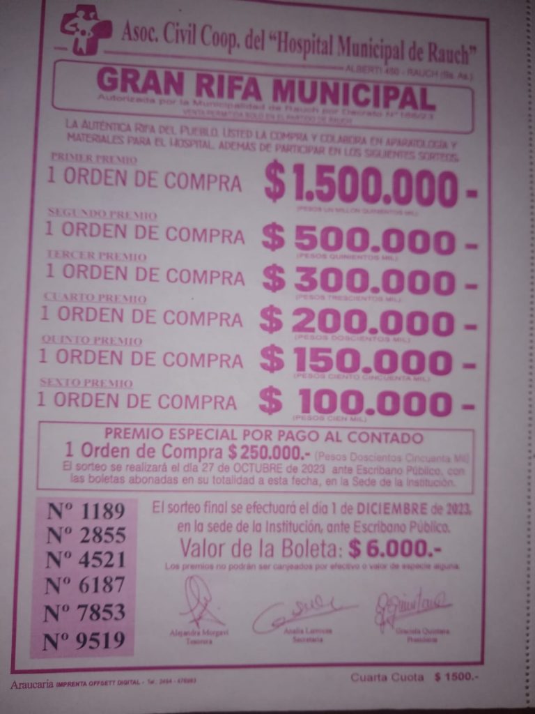 Graciela Quintana, presidenta de la Asociación Cooperadora del Hospital Municipal indicó que quedan algunas boletas de la rifa anual que la institución tiene a la venta, y que tendrá su sorteo final el 1 de diciembre. Los premios serán: 1° $1.500.000, 2° $500.000, 3° $ 300.000, 4° $200.000, 5° $150.000 y 6° $100.000. La boleta tiene un costo de $6.000 y contiene seis números.