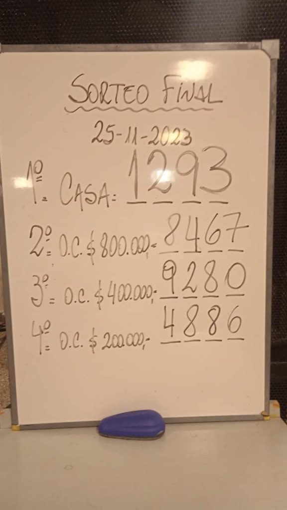 Ganó la casa a estrenar, ubicada en la calle Pellegrini, con el número 1293, mientras que el segundo premio (una orden de compra por 800 mil pesos) fue para el número 8467, el tercero (orden de compra de 400 mil) para el 9280 y el cuarto ($200 mil) para el 4886.
