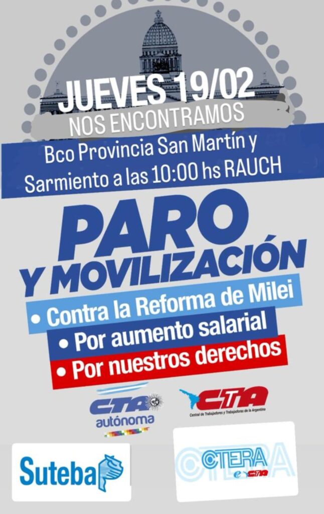 En el marco del Paro Nacional convocado para este jueves 19 de febrero, trabajadores y trabajadoras de Rauch se movilizan en adhesión a la medida impulsada por el Frente de Sindicatos Unidos (FreSU), en coincidencia con el tratamiento del proyecto de reforma laboral en la Cámara de Diputados.
