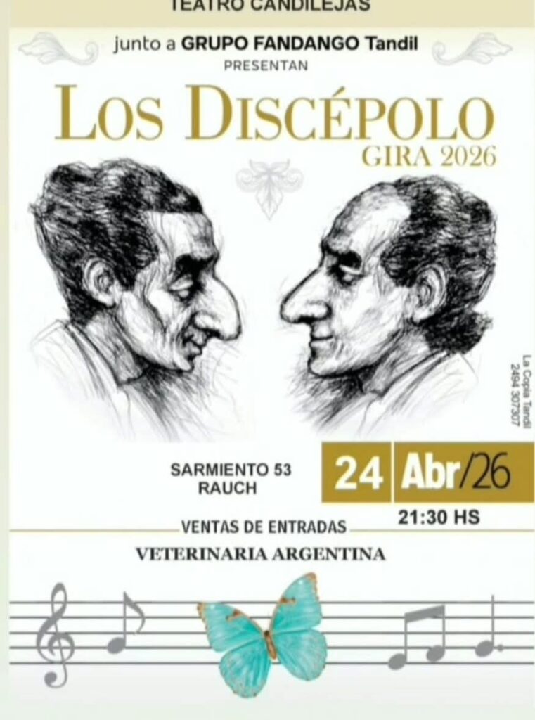 Este viernes 24 de abril, a las 21:30 horas, el Teatro Candilejas de Rauch será escenario de la presentación de “Los Discépolo”, una obra que combina teatro, música en vivo y relato histórico para adentrarse en la vida y el legado de dos figuras fundamentales de la cultura argentina: Armando y Enrique Santos Discépolo.
